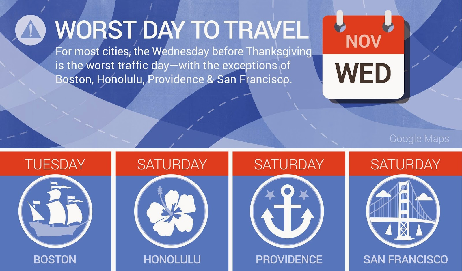You’ve got enough on your plate this Thanksgiving without having to worry about traffic, too. So, Google Maps looked at Thanksgiving traffic conditions over the last two years for 21 cities across the U.S.1 to find the most useful information to make your holiday trip a little easier.