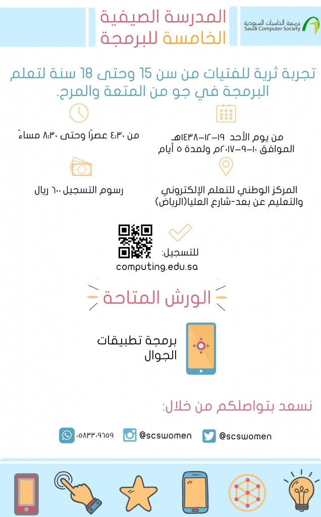 أعلن الفرع النسائي بجمعية الحاسبات السعودية عن إطلاق النسخة الخامسة من المدرسة الصيفية لتعليم الفتيات البرمجة والتي يستضيفها المركز الوطني للتعلّم الإلكتروني والتعليم عن بُعد.